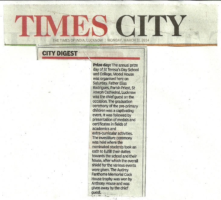 The annual Prize Day of St. Teresa's Day School & College, Model House, Lucknow was organised here on 31-Mar-2014.