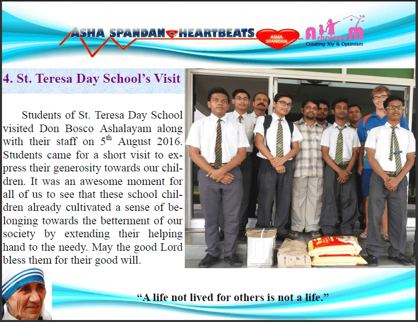 Students of St. Teresa's Day School & College visited Don Bosco Ashalayam along with their staff on 5-Aug-2016. Students came for a short visit to express their generosity towards our children.