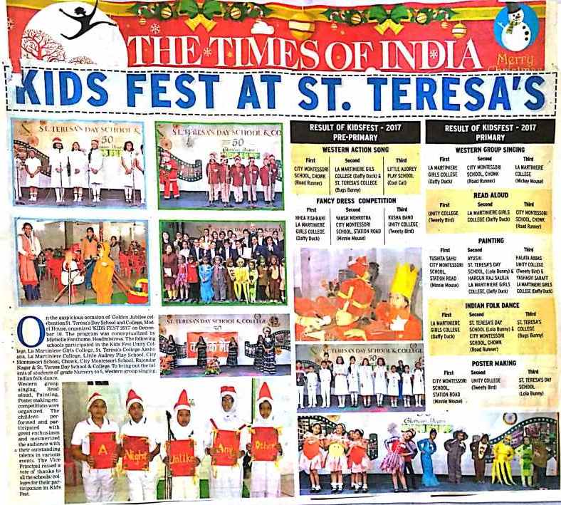 On the auspicious occasion of Golden Jubilee celebration St. Teresa's Day School and College, Model House, organized 'KIDS FEST 2017' on December 18 2017. The Program was conceptualized by Michelle Fanthome, Headmistress. The Following Schools participated in the Kids Fest - Unity College, La Martiniere Girls College, St. Teresa's College Aashiana, La Martiniere College, Little Audrey Play School, City Montessori School,Chowk, City Montessori School, Rajendra Nagar & St. Teresa's Day School & College.