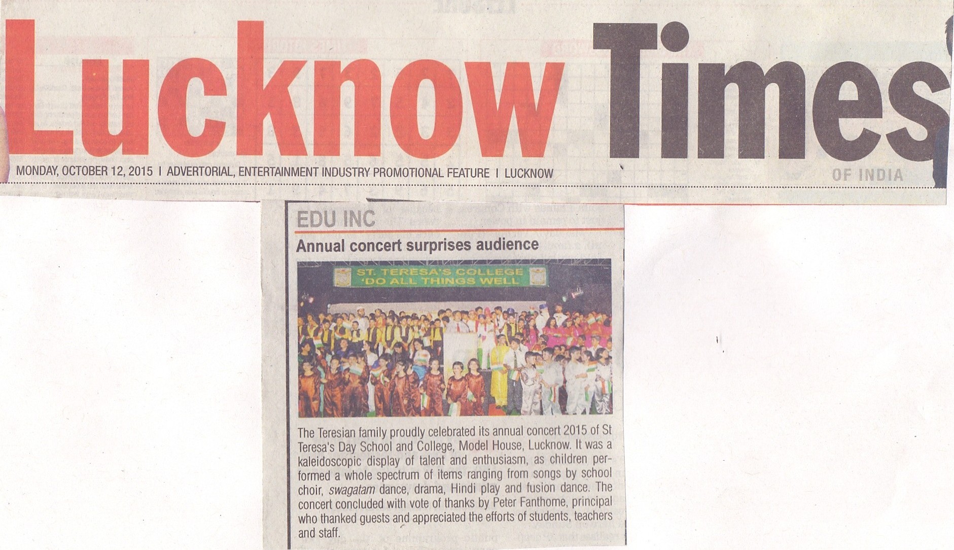The Teresian family proudly celebrated its annual concert 2015 of St. Teresa's Day School & College, Model House , Lucknow. It was a kaleidoscopic display of talent and enthusiasm.